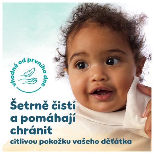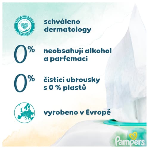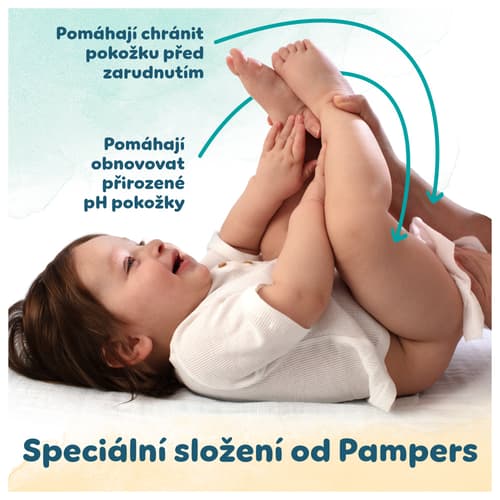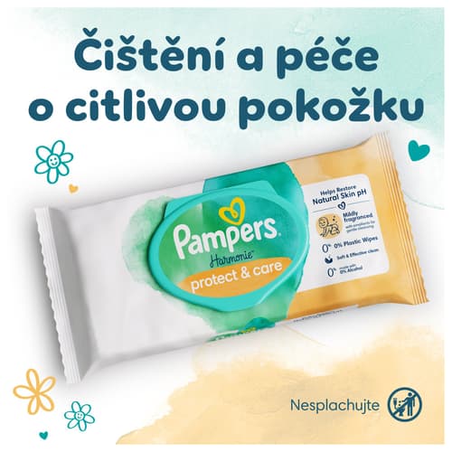 Dětské vlhčené ubousky Harmonie Protect & Care značky Pampers. Jsou šetrnější než vodou navlhčená bavlněná látka, díky svému jedinečnému složení pomáhají obnovovat přirozené pH pokožky, a tak ji chrání před podrážděním.