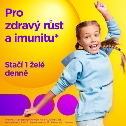 V 1 želé je obsažen vitamin A (retinyl-acetát, RE) 330 µg (41 % RHP*), vitamin D (cholekalciferol) 5 µg (100 % RHP*), vitamin E (DL-α-tokoferyl-acetát, α-TE) 5 mg (42 % RHP*), vitamin C (kyselina L-askorbová) 40 mg (50 % RHP*), niacin (nikotinamid, NE) 8 mg (50 % RHP*), vitamin B6 (pyridoxin-hydrochlorid) 0,8 mg (57 % RHP*), vitamin B12 (kyanokobalamin) 1 µg (40 % RHP*), biotin (D-biotin) 12 µg (24 % RHP*), zinek (síran zinečnatý) 2,8 mg (28 % RHP*), jód (jodid draselný) 50 µg (33 % RHP*), Glukózový sirup; cukr; želatina; vitamin C (kyselina L-askorbová); regulátor kyselosti (kyselina citronová); nikotinamid; maltodextrin; vitamin E (DL-α-tokoferyl-acetát); síran zinečnatý; potravinové barvivo (koncentrát z mrkve a černého rybízu, ředkve, světlice barvířské, černé mrkve, třešně); přírodní aromata (pomerančové, třešňové, jahodové, malinové); rostlinné oleje (kokosový, řepkový); vitamin B6 (pyridoxin-hydrochlorid); vitamin A (retinyl-acetát); lešticí látky: karnaubský vosk, včelí vosk; jodid draselný; biotin (D-biotin); vitamin D (cholekalciferol); vitamín B12 (kyanokobalamin). *RHP - Referenční hodnota příjmu