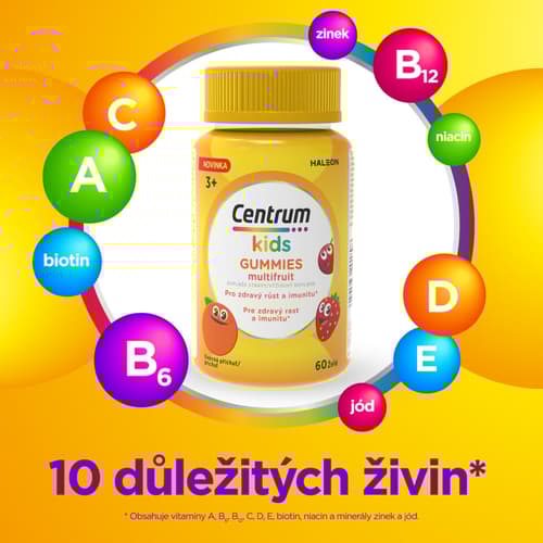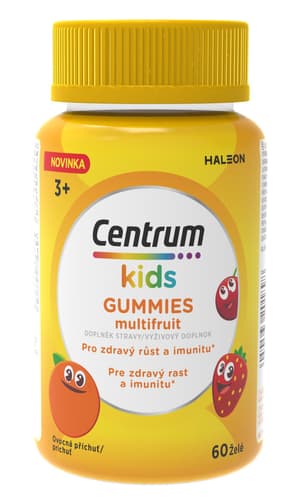 Doplněk stravy Centrum Kids Gummies multifruit želé je ve formě žvýkacích želé, které jsou určeny speciálně pro děti od 3 let. Tyto žvýkací vitamíny představují zábavný a snadný způsob, jak dětem doplnit potřebnou denní výživu. Díky chutné kombinaci ovocných příchutí pomeranče, citronu, jahody a maliny, si děti oblíbí jejich každodenní užívání. Centrum Kids Gummies obsahuje vitamín A, který přispívá k udržení normálního stavu zraku. Vitamín C přispívá k normální funkci imunitního systému a k normální psychické činnosti. Vitamín D přispívá k udržení normálního stavu kostí i zubů. Vitamín E přispívá k ochraně buněk před oxidativním stresem. Zinek je minerál, který přispívá k udržení normálního stavu zraku a kostí i k normální funkci imunitního systému. Jod přispívá k normálním rozpoznávacím funkcím. Želatinky jsou vhodné i pro vegetariány a neobsahují umělá barviva. Nepřekračujte doporučené denní dávkování. Uchovávejte mimo dosah dětí. Doplňky stravy nejsou náhradou pestré a vyvážené stravy. Balení obsahuje 60 kusů želé.