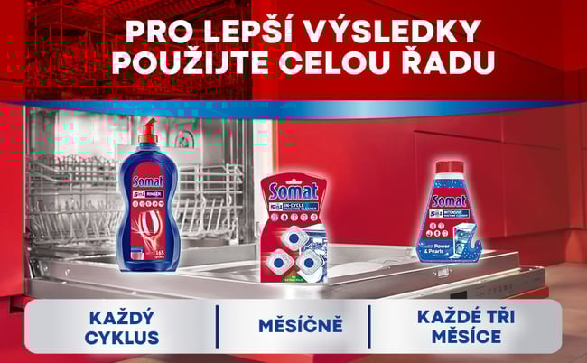 Jedna kapsle pro všechny stupně znečištění. Kapsle Somat Excellence 5in1 poskytují perfektní čisticí účinek, i když kontrolky soli a oplachovače svítí. V obou případech je funkce oplachování i změkčování vody zachována. Pro tvrdou vodu nad 21°dH použijte vždy Somat Excellence 5in1 kapsle v kombinaci se speciální solí do myčky Somat Special Salt. Informace o tvrdosti vody získáte u svého dodavatele vody.
