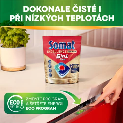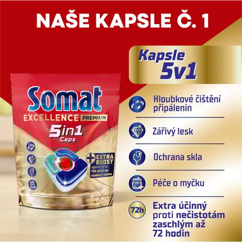 Somat Excellence 5v1 kapsle na nádobí navrženy tak, aby účinně odstraňovaly až 72 hodin zaschlé odolné skvrny a zajistily hloubkově čistý výsledek. S kapslemi Somat Excellence na automatické mytí nádobí se můžete spolehnout, že všechno vaše nádobí, které lze umýt v myčce – od talířů, sklenic, hrnků, lahví, hrnců, plastového nádobí až po pánve, bude účinně vyčištěno a zůstane beze skrvn. Toto nové složení snižuje nutnost ručního čištění. Kapsle má biologicky rozložitelný a ve vodě rozpustný obal.