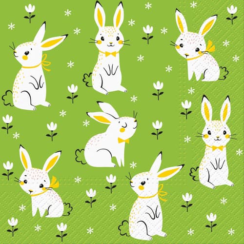 Balení 20 papírových ubrousků s velikonočním motivem zajíčků. Rozměr ubrousku 33 × 33 cm.