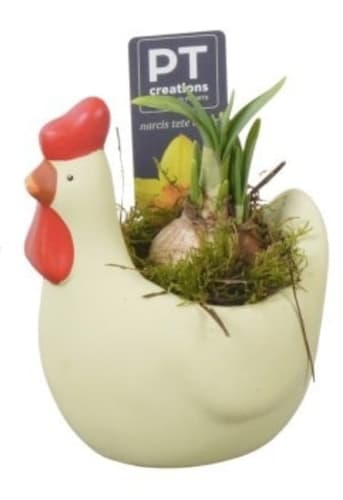 Ozdobte si velikonoční stůl narciskami v keramickém květináči ve tvaru slepičky. Vhodné jako dekorace do domácnosti, na balkon či terasu.