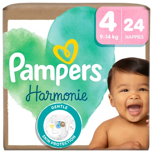 Jednorázové dětské plenky Pampers Harmonie Baby pro děti o hmotnosti 9–14 kg. Poskytují jemnou ochranu pokožky a obsahují složky rostlinného původu. Hebká absorpční povrchová vrstva z rostlinných materiálů odvádí vlhkost a stolici od pokožky děťátka. Kalhotky navíc obsahují pečlivě vybranou prémiovou bavlnu, která zajišťuje pohodlí v každé situaci.
