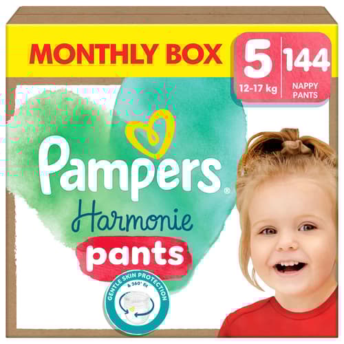 Jednorázové dětské plenkové kalhotky Pampers Harmonie Baby pro děti o hmotnosti 12–17 kg. Poskytují jemnou ochranu pokožky a obsahují složky rostlinného původu. Hebká absorpční povrchová vrstva z rostlinných materiálů odvádí vlhkost a stolici od pokožky děťátka. Kalhotky navíc obsahují pečlivě vybranou prémiovou bavlnu, která zajišťuje pohodlí v každé situaci.