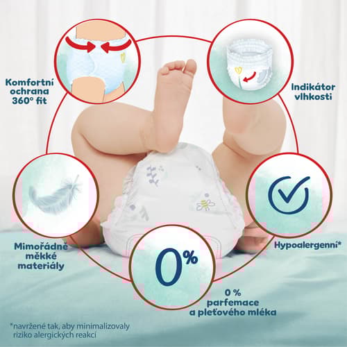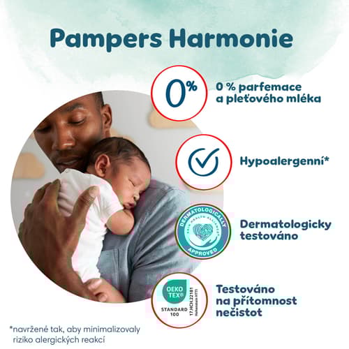 Jednorázové dětské plenkové kalhotky Pampers Harmonie Baby pro děti o hmotnosti od 15 kg. Poskytují jemnou ochranu pokožky a obsahují složky rostlinného původu. Hebká absorpční povrchová vrstva z rostlinných materiálů odvádí vlhkost a stolici od pokožky děťátka. Kalhotky navíc obsahují pečlivě vybranou prémiovou bavlnu, která zajišťuje pohodlí v každé situaci.