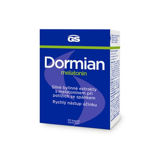 Doplněk stravy. GS Dormian Melatonin obsahuje vysokou dávku kozlíku lékařského (1000 mg v denní dávce) a vysoké dávky extraktů meduňky, chmele a mučenky. Látky těchto extraktů napomáhají přirozenému usínání a spánku. Nyní je 2x silnější a navíc obohacen o melatonin. Melatonin je našemu tělu vlastní látka, kterou si tělo tvoří v části mozku zvané šišinka (epifýza). Melatonin je důležitý pro střídání spánku a bdělosti. Výhody: Speciální kapsle, která se rychleji rozpadá v žaludku. Jedinečná kombinace standardizovaných přírodních extraktů z rostlin. Šetrný k organismu, nenávykový. Vhodný pro jednorázové i dlouhodobé užívání. Jednoduché dávkování – jen 1 kapsle denně. Nepřekračujte doporučené denní dávkování. Uchovávejte mimo dosah dětí. Doplňky stravy nejsou náhradou pestré a vyvážené stravy. Balení obsahuje 30 kapslí. Hmotnost obsahu 12,87 g.