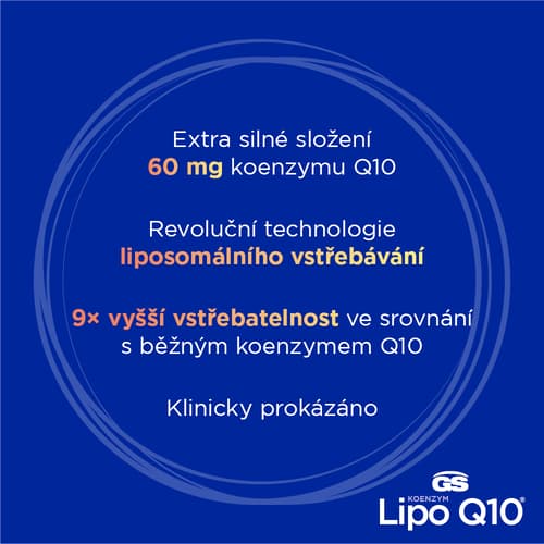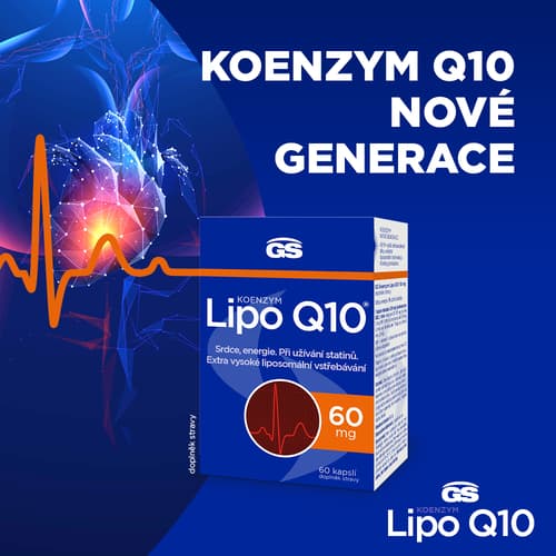 Doplněk stravy. GS Koenzym Lipo Q10® obsahuje 60 mg koenzymu v 1 kapsli, navíc s unikátní technologií liposomálního vstřebávání, pro 9× vyšší vstřebatelnost ve srovnání se standardním koenzymem Q10. Díky využití revoluční technologie liposomálního vstřebávaní se koenzym Q10 stane součástí liposomů, které pronikají snáze přes membrány buněk do tkání a umožňují tak, aby koenzym Q10 byl pro tělo lépe dostupný. GS Koenzym Lipo Q10® je obohacen o vitamín B1 pro podporu normální činnosti srdce, normální energetický metabolismus, psychickou a nervovou činnost. Přípravek obsahuje také slunečnicový olej, který je zdrojem kyseliny linolové a kyseliny olejové, což jsou omega-6 a omega-9 nenasycené mastné kyseliny. Vhodné při užívání statinů. Nepřekračujte doporučené denní dávkování. Uchovávejte mimo dosah dětí. Doplňky stravy nejsou náhradou pestré a vyvážené stravy. Balení obsahuje 60 kapslí. Hmotnost obsahu 19,2 g.