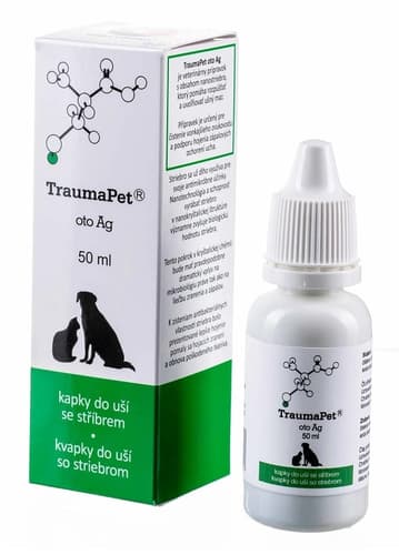Veterinární přípravek TraumaPet kapky do uší s Ag napomáhá rozpouštění a uvolňování ušního mazu u všech druhů chovaných zvířat. Obsahuje nanostříbro. Stříbro se využívá pro své antimikrobní účinky. Prostředek nevykazuje toxické účinky. Balení obsahuje 50 ml.