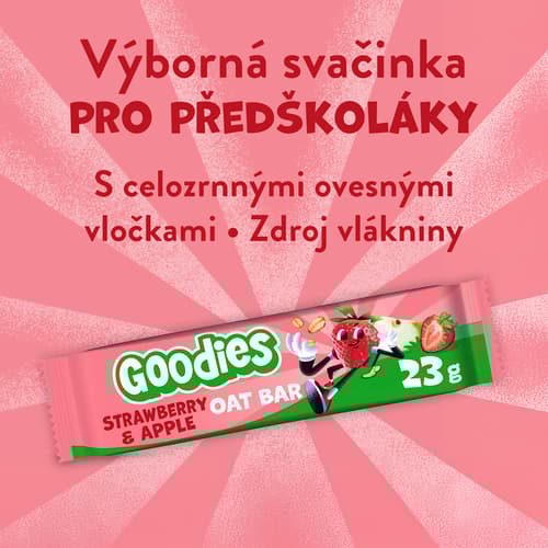 Ovesná tyčinka Goodies s jahodami, jablky a celozrnnými vločkami je praktickou volbou pro předškoláky. S její šťavnatou a měkkou konzistencí je ideální jako svačina na cesty nebo do svačinových boxů. Neobsahuje žádné přidané cukry a soli, takže si můžete vychutnat ovocný zážitek bez obav o zbytečné přísady.