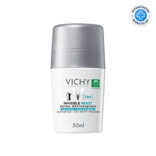 VICHY INVISIBLE Resist je účinný antiperspirant, který poskytuje 72hodinovou ochranu proti potu, skvrnám i podráždění pokožky v důsledku holení (neobsahuje ethanol). Hypoalergenní složení se snadno roztírá a umožňuje bezproblémové nošení pod jakýmkoliv oblečením, zároveň je vhodné pro každodenní použití i v případě citlivé pokožky. Antiperspirant obsahuje chlorhydrát hliníku, který zastavuje pocení a zápach dříve, než se projeví. Dimetikon vytváří na pokožce ochrannou bariéru pro extra dlouhou ochranu. Balení obsahuje 50 ml.