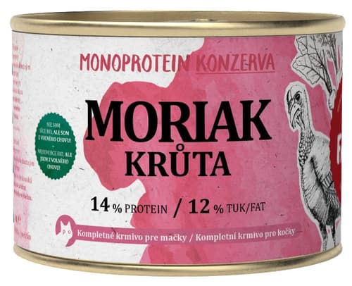 Moriak je konzerva pro kočky s vysokým obsahem čerstvého krůtího masa z free-range farem. Je obohacena o zeleninu a bylinky, díky kterým je ideální pro všechny věkové skupiny vašich chlupatých mazlíčků. Konzerva je s vysokým podílem bílkovin a nízkým obsahem sacharidů vhodná také pro méně aktivní kočky.