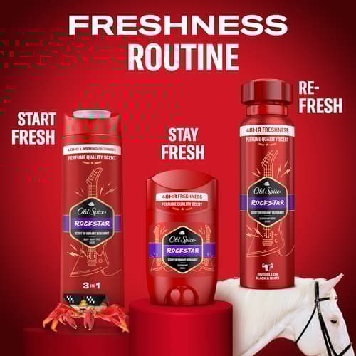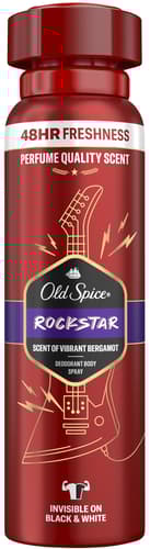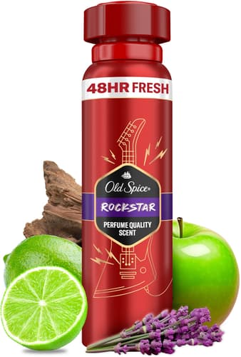Old Spice Rockstar pánský tělový deodorant s citrusovou vůni bergamotu, křupavého jablka a s dřevitými tóny. Nezanechává stopy na černém a bílém oblečení. Bez obsahu hliníku.