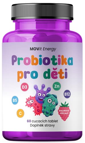 MOVit Energy probiotika pro děti jsou speciálně vyvinutý doplněk stravy ve formě cucavých tablet. Obsahují přátelské probiotické bakterie Lactobacillus reuteri, zinek a vitamíny C, D, B5 a B12, které přispívají k normální funkci imunitního systému. Zinek navíc podporuje zdravý zrak, vlasy a nehty. Balení obsahuje 60 tablet.
