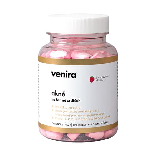 Doplněk stravy. Venira akné ve formě srdíček s malinovou příchutí obsahuje komplex pečlivě vybraných aktivních složek jako je zinek, vitamín A, C, H a vybrané vitamíny skupiny B. Vitamín A přispívá k udržení normálního stavu pokožky, vitamín C působí jako antioxidant a napomáhá k normální tvorbě kolagenu pro normální funkci kůže, dásní, kostí, chrupavek, zubů a krevních cév, vitamín D3 napomáhá udržet normální činnost svalů a normální stav zubů i kostí, vitamín E přispívá k ochraně buněk před oxidativním stresem, vitamín B3 přispívá k udržení normálního stavu pokožky a sliznic, vitamín B6 působí příznivě na normální tvorbu červených krvinek, vitamín B5 napomáhá k udržení normálního stavu vlasů a kůže, zinek přispívá k udržení normálního stavu nehtů, vlasů i pokožky a napomáhá ke správnému metabolismu vitamínu A, selen podporuje udržení normálního stavu nehtů a vlasů. Venira Kolagen ve formě srdíček malina neobsahuje lepek ani cukr. Nepřekračujte doporučené denní dávkování. Uchovávejte mimo dosah dětí. Doplňky stravy nejsou náhradou pestré a vyvážené stravy. Balení obsahuje 120 cucavých tablet.