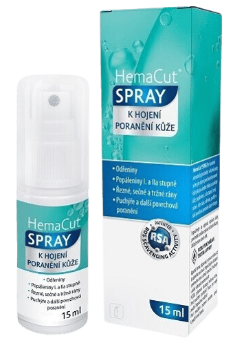 Zdravotnický prostředek. HemaCut Spray ve formě spreje je určený k hojení povrchových poranění kůže jako jsou drobné trhliny a praskliny kůže, popáleniny I. a II. stupně, řezné, sečné a tržné rány, odřeniny, puchýře a další. Obsahuje patentovaný síťovaný polymer TRISS. Sprej po aplikaci: hojí rány a zamezuje vzniku zánětu, vytvoří na kůži suchou, průhlednou a voděodolnou vrstvu, chrání ránu před infekcí z vnějšku, zajišťuje bezbolestnou a bezkontaktní aplikaci na ránu, nepálí. Film je transparentní po celou dobu hojení, čímž zajistí snadné sledování stavu rány. Lahvička s mechanickým rozprašovačem obsahuje 15 ml.