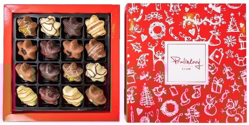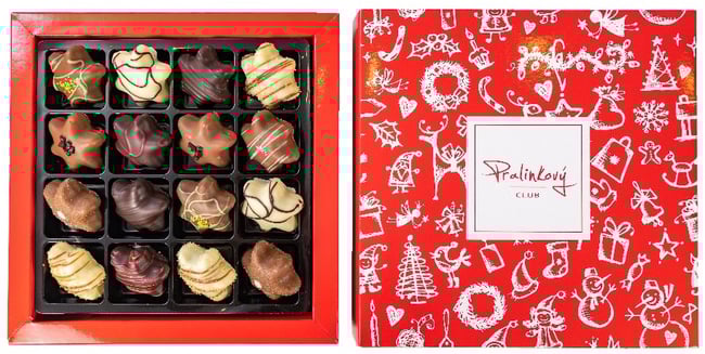 Výběr čokoládových vánočních pralinek. Pralinkový Club používá jen ty nejkvalitnější suroviny, bez palmového oleje.