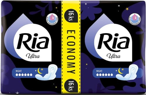 Ultratenké dámské vložky Ria Ultra Night poskytují spolehlivou ochranu. Díky extra savému jádru, které přemění tekutinu na gel, zajišťují dokonalou absorpci a tekutinu nikdy nepropustí. Hedvábně jemný povrch a elegantní potisk dodávají pocit jemnosti a pohodlí.
