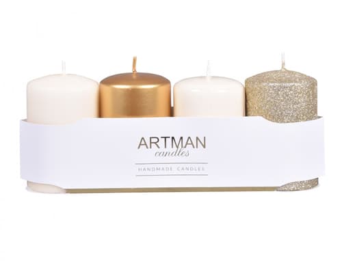 Set adventních svíček, z nichž každá má jiný povrch (matný, lakovaný, metalický a brokátový). Ozvláštní adventní věnec, ale i jakoukoliv dekoraci ze svíček. V atraktivních barvách.