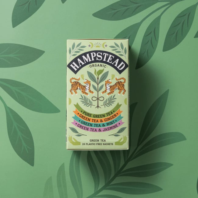 Selekce zelených čajů obsahuje jednotlivě balené sáčky čistého zeleného čaje, zeleného čaje s mátou a lékořicí, zeleného čaje se zázvorem a zeleného čaje s jasmínem a bergamotovým olejem. Čajové lístky pro čaje Hampstead Tea London pochází z indické oblasti Darjeeling, přesněji z čajové zahrady Makaibari. Pěstování v této oblasti subtropického pásu začalo již v roce 1859. Nachází se zde první, dosud rodinná, továrna na zpracování čaje na světě. Všechny čaje jsou sklízeny výhradně ručně.