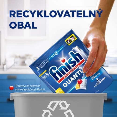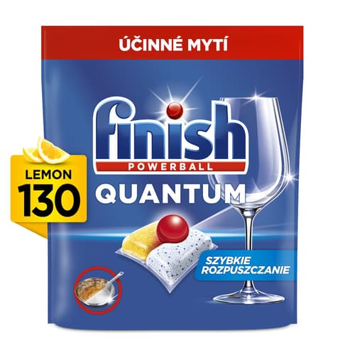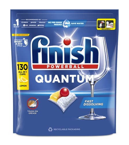 Finish Quantum All in 1 pro opravdovou čistotu a zářivý lesk vašeho nádobí vždy a hned napoprvé. Jeho kompaktní tříkomorové složení je efektivní v odstraňování všech typů nečistot od jídla, a to dokonce i bez předmývání. S 25 % méně chemické zátěže (vztaženo na hmotnost vs Finish Power All in 1).