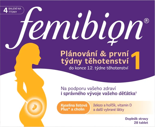 Doplněk stravy. Femibion 1 je přípravek speciálně vyvinutý na podporu Vašeho zdraví při plánování těhotenství a zdraví Vašeho dítěte v prvních 12 týdnech od početí. Svým složením je přizpůsoben specifickým potřebám jednotlivých stádií vývoje dítěte. Femibion® 1 obsahuje kyselinu listovou Plus, což je kombinace kyseliny listové a Metafolinu®. Metafolin® je biologicky aktivní a přímo dostupná forma folátu, tzv. „aktivní folát“, který vaše tělo nebude muset dále přeměňovat. Tableta dále obsahuje: cholin, vitaminy B1, B2, B6, B12, C, D, E, biotin, niacin, kyselinu pantothenovou, jód, železo a selen. S praktickým označením dnů v týdnu na blistru pro sledování denní dávky. Nepřekračujte doporučené denní dávkování. Uchovávejte mimo dosah dětí. Doplňky stravy nejsou náhradou pestré a vyvážené stravy. Balení obsahuje 28 tablet. Hmotnost 26,1 g.