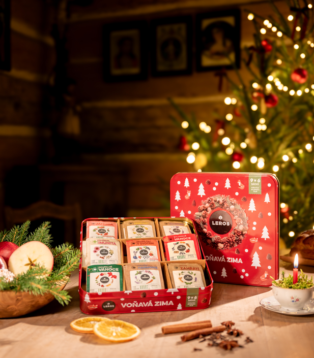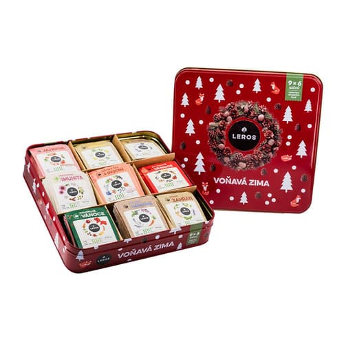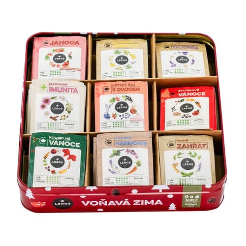 Vychutnejte si zimní pohodu se směsí bylinných čajů Voňavá zima, která je balena v plechové dárkové krabici.