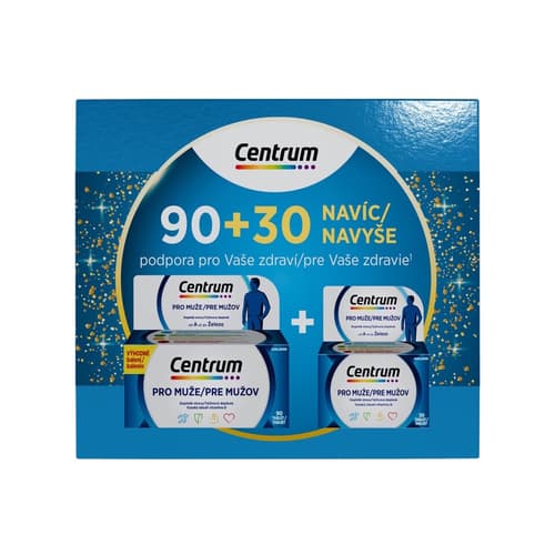 Doplněk stravy. Centrum pro muže byl speciálně vyvinut pro podporu výživy mužů. Tento produkt nabízí vysoce kvalitní výživové složení, které je přizpůsobeno jejich specifickým výživovým potřebám. Nabízí kompletní řadu vitamínů, minerálů a navíc stopové prvky. Nové vylepšené složení se zvýšeným množstvím vitaminu D. Zahrnují podporu každodenní vitality, díky obsahu vitaminů skupiny B, které přispívají k normálnímu energetickému metabolismu. Centrum pro muže také obsahuje přizpůsobená množství vitaminů A, C a D, mědi, selenu a zinku, která podporují normální funkci imunitního systému. Tento doplněk stravy obsahuje přizpůsobená množství vápníku, vitaminu D a hořčíku, která se podílí na normální činnosti svalů. K normální činnosti srdce přispívá vitamin B1, obsažený v tomto produktu. Centrum pro muže je bez cukru a vhodné pro osoby s nesnášenlivostí lepku. Nyní ve vánočním dárkovém balení, 30 tablet navíc zdarma. Nepřekračujte doporučené denní dávkování. Uchovávejte mimo dosah dětí. Doplňky stravy nejsou náhradou pestré a vyvážené stravy. Balení obsahuje 120 tablet. Hmotnost: 157 g.