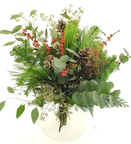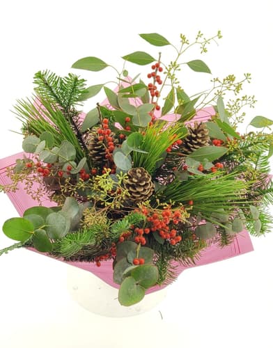 Velká impozantní kytice, která vnese do vašeho domova vánoční atmosféru. Velikost kytice je vhodná také k narozeninám či jinému významnému výročí, ale i jen tak pro radost jako krásná dekorace domácnosti. Průměr kytice cca 45 cm.