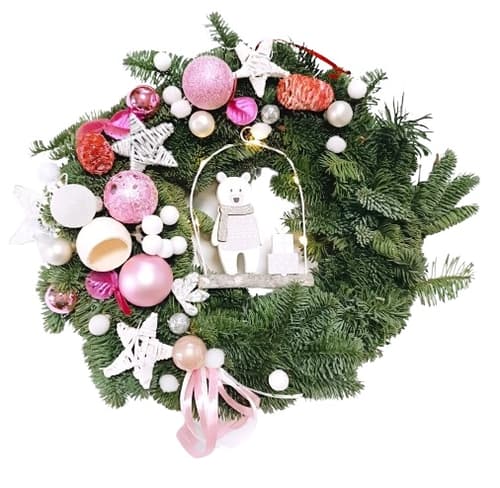 Vánoční věnec na dveře – růžový s osvětlením Ø 30 cm