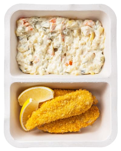 Složení: Bramborový salát 60,5 % [Brambory 32 %, rostlinná majonéza 32 % (olej slunečnicový, SÓJOVÝ nápoj (pitná voda, SÓJOVÉ boby 13,5 %, mořská sůl), HOŘČICE dijonská (pitná voda, HOŘČIČNÉ semínko, ocet kvasný lihový, jedlá sůl, kurkuma, stabilizátor: xanthan), citronová šťáva, jedlá sůl, pepř černý mletý, česnek), okurky s nálevem 12,5 % (okurky, pitná voda, ocet kvasný lihový, cukr, cibule 1,4 %, jedlá sůl, HOŘČIČNÉ semínko, kořenící výtažek), mrkev 7,2 %, cibule žlutá, hrášek v mírně slaném nálevu (hrášek, pitná voda, cukr, jedlá sůl), CELER, petržel, HOŘČICE plnotučná (pitná voda, HOŘČIČNÉ semínko, ocet kvasný lihový, cukr, jedlá sůl, kurkuma, výtažek koření), jedlá sůl, pepř černý mletý], rostlinné filety 32,5 % [pitná voda, PŠENIČNÁ bílkovina, hrachová bílkovina, PŠENIČNÁ mouka, modifikovaný škrob, strouhanka (obsahuje LEPEK), bambusová vláknina, zahušťovadlo: methylcelulóza; slunečnicový olej, zpevňující látka: uhličitany vápenaté; přírodní aromata, jedlá sůl, pepř], citron.