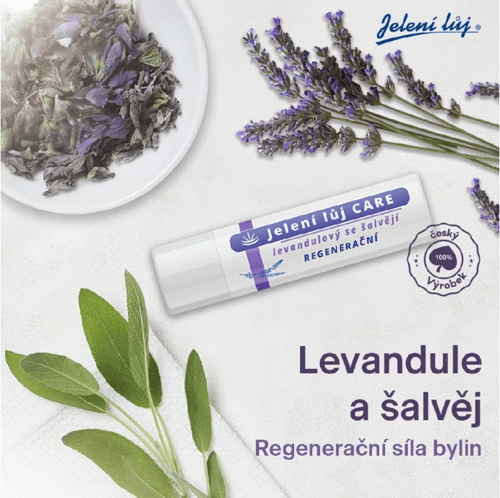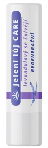 Jelení lůj CARE Levandulový se šalvějí s unikátní recepturou pro nejnáročnější uživatele. Pečlivě namíchané silice zajišťují přirozenou vůni, ricinový olej podporuje ostatní látky v omlazovacích účincích na pokožku, karnaubský vosk je konzervuje ochranným filmem. Šalvějový extrakt pomáhá k prokrvení pokožky, levandulová silice k jejímu zklidnění, a tedy ke kvalitnější regeneraci. Vše podporují antioxidační účinky vitamínu E. Balení obsahuje 4,5 g.