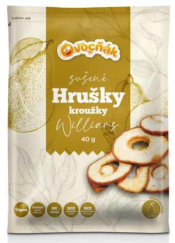 Sušené hruškové kroužky neobsahují nic jiného než 100 % ovoce bez dalších přidaných přísad. Navíc nejsou sířené a jsou vyrobeny z těch nejsladších odrůd hrušek Williams ze sadů z Vlčnova, kde je místo pesticidů zalévá slunce a občasné deště. Ručně jsou vybrány jen ty nejhezčí hrušky, a na jedno balení se spotřebují až dvě středně velké.