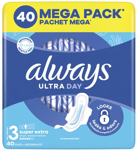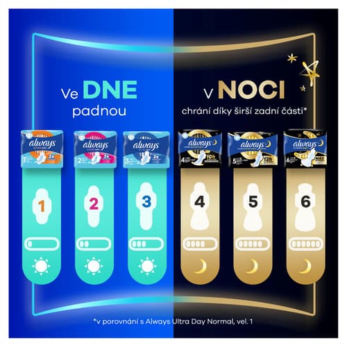 Hygienické vložky s křidélky Always Ultra den a noc (velikost 3) poskytují spolehlivou ochranu během dne i noci. Rychle absorbují tekutinu, zabraňují protečení a pomáhají neutralizovat zápach, čímž zajišťují pocit svěžesti a pohodlí.