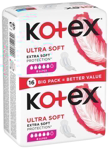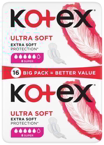 Ultratenké menstruační vložky KOTEX® Ultra Soft byly vyvinuty pro šetrnou a citlivou pokožku. Varianta Super je kombinací pevnosti, měkkosti, spolehlivosti a péče o ženské tělo. Horní vrstva vložky je extra měkká a obsahuje 3D jádro, které udržuje vlhkost uprostřed a křidélka chrání spodní prádlo a oblečení.