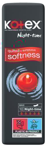 Vložky KOTEX® Maxi Night jsou speciálně navržené pro zvýšenou ochranu během noci. Prodloužená vložka bezpečně chrání před prosáknutím a jádro pomáhá zachovat povrchovou vrstvu suchou. Díky svoji savosti a měkkosti povrchu jsou velice oblíbené zejména ženami po porodu.