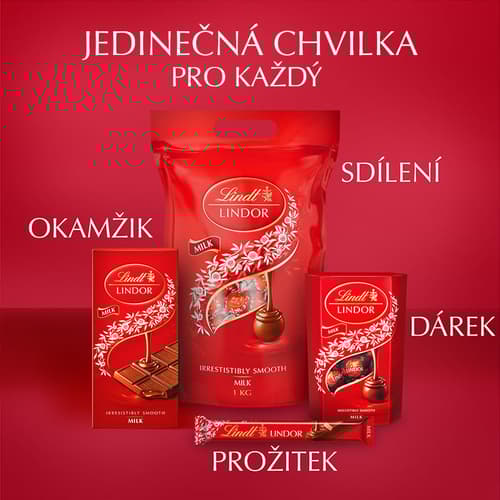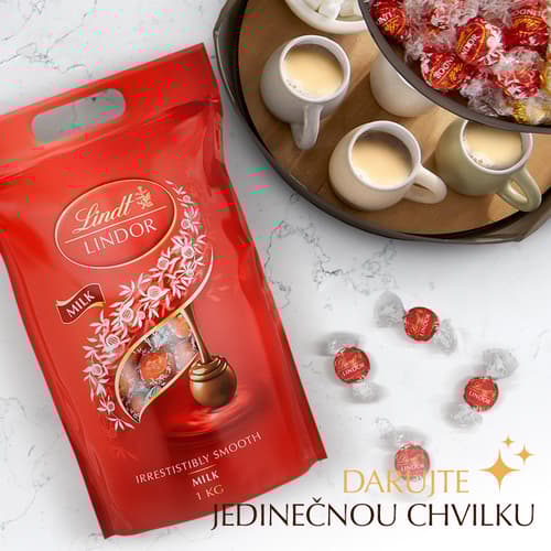 Pralinky Lindor z mléčné čokolády s jemnou krémovou náplní ve velkém balení. Obsah kakaové sušiny v mléčné čokoládě nejméně 32 %.