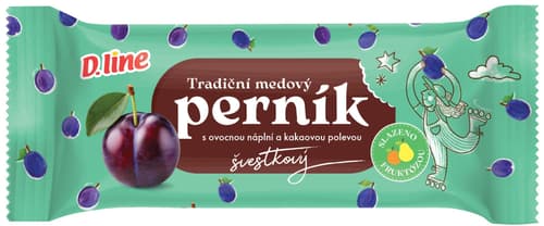Medový perník se švestkovou náplní. Na povrchu je zalitý tmavou polevou. Vhodné pro diabetiky.