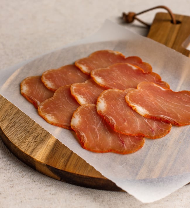 Vepřová panenka Duroc nakrájená na plátky je tradiční španělská delikatesa. Lomo Embuchado je sušená vepřová panenka, která patří mezi nejjemnější a nejchutnější uzeniny ve španělské gastronomii. Tento produkt je vyroben z prvotřídního masa plemene Duroc, které je ceněné pro svou šťavnatost, jemnou texturu a vyvážený poměr libového masa a tuku.