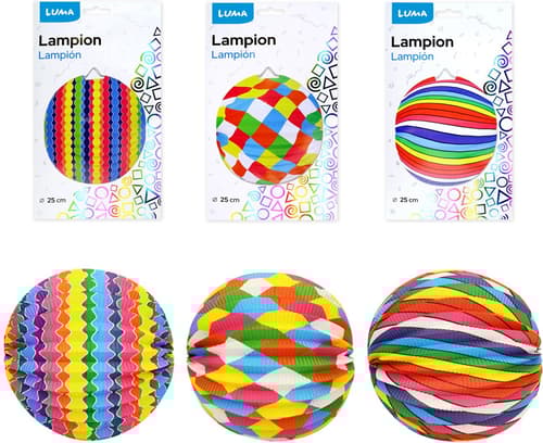 Kulatý barevný lampion obsahuje kovový držák na svíčku a očko na zavěšení.