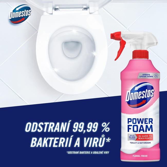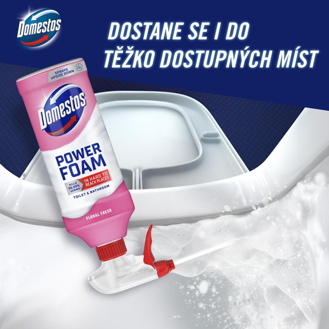 Pěna ve spreji Domestos Power Foam přináší pohodlnější a efektivnější čištění toalety v nové revoluční formě. Speciálně vyvinutý rozprašovač zbaví vaši toaletu virů a bakterií i na těžko dostupných místech. Můžete ho totiž otočit vzhůru nohama a pěnu tak nastříkat i tam, kam to s běžným balením nebylo možné.