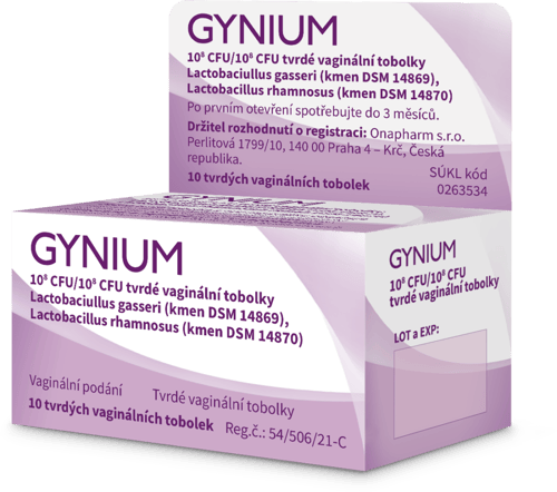 Gynium je léčivý přípravek pro použití v pochvě. Bakteriální kmeny Lactobacillus gasseri a Lactobacillus rhamnosus obsažené v přípravku Gynium jsou součástí přirozené mikrobiální poševní flóry. Gynium se používá: k normalizaci narušené mikrobiální poševní flóry (vaginální mikrobioty) po antibiotické léčbě bakteriální vaginózy (bakteriální poševní infekce), k udržení normální mikrobiální poševní flóry (vaginální mikrobioty) při opakovaných poševních infekcích. Při bakteriální vaginóze (bakteriální poševní infekci) je normální bakteriální rovnováha v pochvě narušena: objevuje se zvýšený výskyt určitých typů bakterií a v důsledku toho je zvýšená hodnota pH v pochvě. Obvykle se mohou objevit tyto příznaky: zvýšený a nepříjemně zapáchající výtok (připomínající rybinu), svědění a pálení. Bakteriální vaginóza (bakteriální poševní infekce) se obvykle léčí antibiotiky a k následné léčbě lze použít Gynium. Gynium dodává do pochvy živé bakterie mléčného kvašení, které jsou součástí přirozené flóry v pochvě. Tyto bakterie se v pochvě přirozeně množí a podporují ochranné mechanismy proti poševním infekcím. Bakterie produkují kyselinu mléčnou a pomáhají tak obnovit přirozenou hodnotu pH v pochvě. Přilnutím k poševní sliznici laktobacily omezují schopnost nežádoucích bakterií růst. Kromě kyseliny mléčné produkuje Lactobacillus gasseri také peroxid vodíku, a tím pozitivně ovlivňuje poševní flóru. Tyto vlastnosti bakterií mléčného kvašení jsou důležité pro obnovení a zachování přirozené poševní flóry. Balení obsahuje 10 tvrdých vaginálních tobolek.