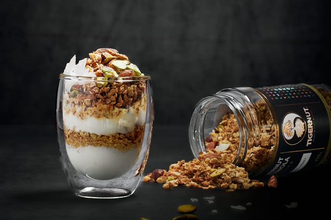 Křupavá granola z tygřích ořechů je přirozeně sladká, plná vlákniny a zdravých tuků. Granola je bezlepková, bezlaktózová a bez přidaného cukru. Navíc je lehce stravitelná a neobsahuje žádné konzervanty, aditiva, emulgátory, barviva ani aromata. Granola obsahuje lyofilizované borůvky, maliny, jahody a goji. Navíc je dochucená čekankovým sirupem.