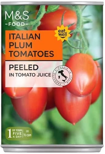 Loupaná rajčata v rajčatové šťávě značky Marks & Spencer. Výběrová rajčata jsou pěstovaná na úrodných italských polích. Jsou sklízena a balena přímo v sezóně, aby si zachovala maximální sladkost, svěžest a přirozenou šťavnatost.
