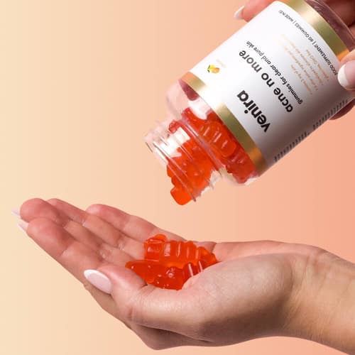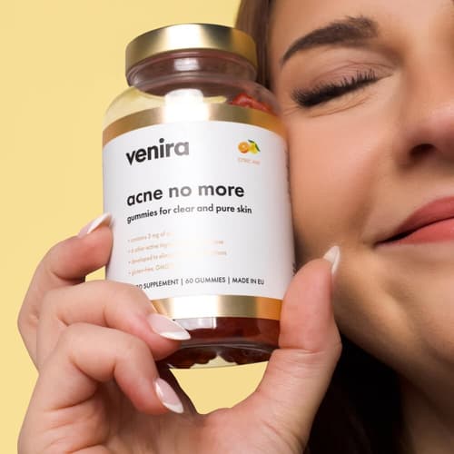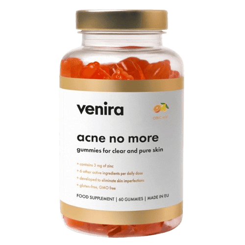 Doplněk stravy. Acne No More značky VENIRA je doplněk stravy ve formě gumových medvídků s citrusovou příchutí. Tento produkt obsahuje vyváženou směs vitamínů, minerálů a dalších látek, které přispívají k udržení normálního stavu pokožky1. Vitamín A (retinol)1 pomáhá udržovat normální stav pokožky a sliznic. Vitamín C působí jako antioxidant a podporuje vstřebávání a produkci kolagenu. Vitamín B7 (biotin)1 podporuje zdravý vzhled pokožky, vlasů a sliznic a přispívá k normálnímu metabolismu makroživin. Zinek1, esenciální minerál, dále podporuje zdraví pokožky, vlasů a nehtů, zatímco selen, silný antioxidant, pomáhá chránit buňky před poškozením způsobeným volnými radikály a podporuje funkci imunitního systému. Složení je obohaceno o extrakt z rýžových otrub a probiotické bakterie Lactobacillus Plantarum. Tento doplněk stravy je bez lepku, laktózy a GMO a je určen pro kúru na 30 dní. Nepřekračujte doporučené denní dávkování. Uchovávejte mimo dosah dětí. Doplňky stravy nejsou náhradou pestré a vyvážené stravy. Balení obsahuje 60 gumových medvídků. Hmotnost obsahu 162 g.