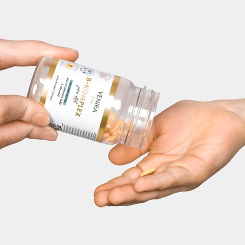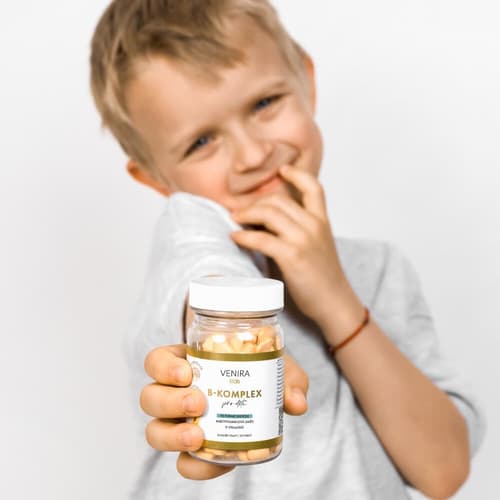 Doplněk stravy. Venira Kids B-komplex pro děti je přírodní doplněk stravy ve formě cucavých tablet s meruňkovou příchutí, vhodný pro děti od 3 let. Tento vitamínový komplex obsahuje 100 mcg kyseliny listové a dalších 8 aktivních látek v jedné tabletě, včetně vitaminů skupiny B a vitaminu C. Složení je obohaceno o antioxidant brusinkový koncentrát, který podporuje obranyschopnost organismu. Vitaminy B6 a B12 podporují normální funkci imunitního systému, zatímco vitaminy B2, B3, B5, B6, B9 a B12 přispívají ke snížení míry únavy a vyčerpání. Vitaminy B1, B2, B3 a B6 podporují energetický metabolismus a vitaminy B1, B3, B6, B12 a biotin přispívají k normální psychické činnosti a činnosti nervové soustavy. Vitaminy B2, B3 a biotin navíc příznivě ovlivňují stav pokožky. Produkt je přírodní, neobsahuje cukr a je slazený sukralózou. Nepřekračujte doporučené denní dávkování. Uchovávejte mimo dosah dětí. Doplňky stravy nejsou náhradou pestré a vyvážené stravy. Balení obsahuje 120 cucavých tablet, což odpovídá kúře na 60 až 120 dní. Hmotnost obsahu: 60 g.