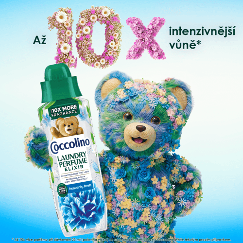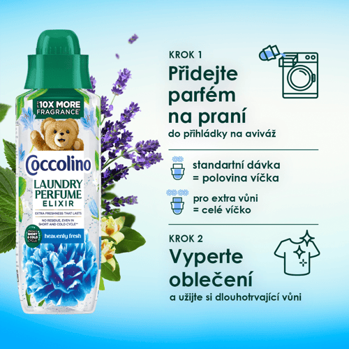 Holandsko,Zažijte až 10× voňavější zážitek s Coccolino parfémem na praní Heavenly Fresh. Tento parfém na praní dodává prádlu intenzivní a dlouhotrvající vůni, která se díky technologii mikroperliček uvolňuje postupně při každém vašem pohybu. Nechte se okouzlit svěží vůní pačuli, levandule a santalového dřeva. Snadno se rozpouští i při krátkých pracích cyklech a nízkých teplotách a je vhodný i pro prádlo sušené v sušičce.
