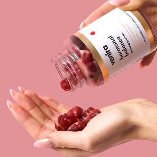 Doplněk stravy. Hormonal Balance značky Venira je doplněk stravy ve formě gumových bonbónů s malinovou příchutí. Tento produkt obsahuje směs vitamínů, minerálů a přírodních extraktů. Vitamín B6 pomáhá tělu udržovat stabilní hladiny hormonů, čímž zmírňuje příznaky hormonální nerovnováhy, jako jsou nepravidelné menstruační cykly nebo výkyvy nálad. Tento vitamín také přispívá ke snížení únavy a pocitu vyčerpání, a je důležitý pro správnou funkci nervového systému. Hořčík přispívá k normálnímu energetickému metabolismu a podporuje psychickou činnost. Produkt obsahuje 30 mg silného a standardizovaného extraktu z kořene macy, což je adaptogen a superpotravina, která pomáhá tělu lépe se vyrovnávat se stresem a podporuje celkovou odolnost organismu. Přírodní extrakt z plodů houby reishi posiluje imunitní systém a přirozenou obranyschopnost těla, zatímco extrakt z kořene chřestu hroznovitého přispívá k rovnováze ženských hormonů a tím i k pravidelnému menstruačnímu cyklu. Tento doplněk stravy je bez lepku, laktózy a GMO. Kúra je určena na 30 dní. Nepřekračujte doporučené denní dávkování. Uchovávejte mimo dosah dětí. Doplňky stravy nejsou náhradou pestré a vyvážené stravy. Balení obsahuje 60 gumových bonbónů. Hmotnost obsahu: 162 g.
