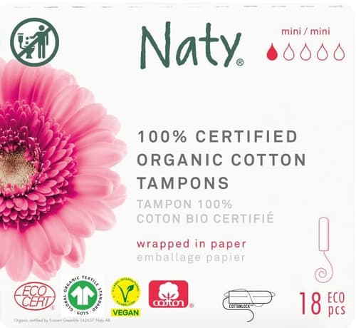 Tampony velikosti mini jsou vyrobené ze 100% organické bavlny, neobsahují chemické látky, chlór, parfémy ani plasty a díky biologicky rozložitelnému složení jsou šetrné k přírodě. Bezpečnostní pláštík udržuje vlákna pevně pohromadě, což zajišťuje spolehlivé a pohodlné nošení. Balení je navíc individuální, papírové a plně kompostovatelné.