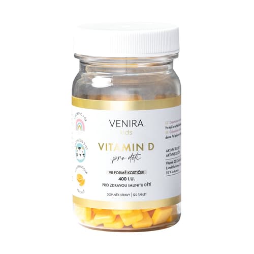 Doplněk stravy. Venira kids Vitamín D je doplněk stravy pro děti ve formě cucavých tablet s pomerančovou příchutí. Obsahuje vitamín D a extrakt kurkumy. Jedná se o 400 I.U. vitamínu D3. Vitamín D přispívá k udržení normálního stavu kostí, správné činnosti svalů a stavu zubů. Podporuje normální funkci imunitního systému a napomáhá správné hladině vápníku v krvi. Bez cukru, slazený sukralózou. Nepřekračujte doporučené denní dávkování. Uchovávejte mimo dosah dětí. Doplňky stravy nejsou náhradou pestré a vyvážené stravy. Balení obsahuje 120 tablet. Hmotnost obsahu 42 g.